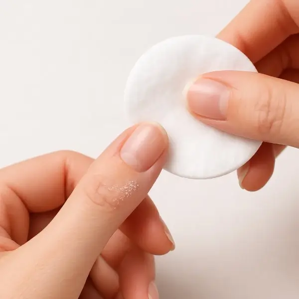 אם הדבק לא זז גם אחרי השריה ושמנים – אפשר לעבור לאצטון. הטיפ הכי חשוב: האצטון צריך לגעת בדבק הציפורניים בלבד, ולא בעור מסביב.
